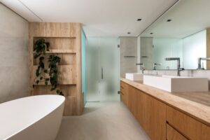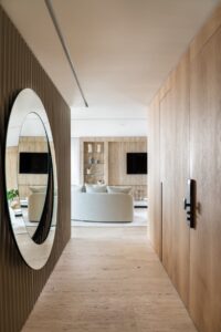 Desde o início, a arquiteta realizou um estudo detalhado de briefing. Esse cuidado refletiu-se em cada decisão tomada ao longo do projeto. A arquiteta partiu do desejo da cliente de ter o mármore travertino bruto como elemento central do projeto, aplicando-o não apenas no piso, mas também em outros detalhes do apartamento. O uso do travertino e da lâmina natural de carvalho branco tornou-se a base estética para a composição do espaço, que valoriza materiais naturais e duráveis, com um toque de sofisticação.