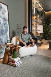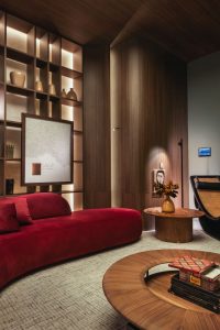 A decoração mescla o novo e o antigo, incorporando objetos de diferentes materiais e estilos, mantendo uma paleta coesa e proporcionando elegância e sofisticação ao espaço, sendo valorizada pela iluminação quente da Mais Led. Na seleção da mobília, optou-se por peças de design atemporal e versátil, capazes de se adaptar harmoniosamente a diferentes épocas e estilos arquitetônicos, proporcionando aos visitantes uma experiência relevante e duradoura. A inclusão de uma peça icônica de Oscar Niemeyer, a chaise, ao lado da entrada, adiciona sofisticação e simboliza a conexão com a arquitetura brasileira.