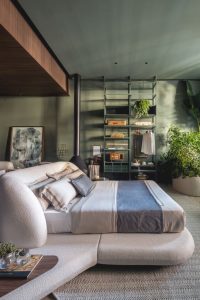 Próximo ao jardim está a cama da Bed&Room, posicionada estrategicamente para que os ocupantes possam dormir apreciando a natureza. Essa proximidade com o verde contribui significativamente para o bem-estar, promovendo uma sensação de tranquilidade e conexão com o ambiente natural. A presença da cama junto ao jardim transforma o espaço em um refúgio sereno, ideal para descanso e rejuvenescimento, integrando conforto e harmonia em um só ambiente.