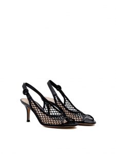 O designer de sapatos Gianvito Rossi aposta numa singela rede de fios, feita à mão, arrematando sandálias e escarpins, como o modelo Alisia, superfeminino e sexy, com um poderoso salto 10,5. O calçado também está disponível em versão mule, com o bico em formato pontudo e aberto, moderno e curinga para qualquer ocasião.