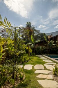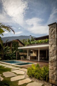 A área social ocupa o térreo em integração total com o lazer externo. A sala de estar com pé-direito duplo é envolvida por amplos painéis de vidro que dissolvem as fronteiras entre interior e exterior, enquanto a cozinha aberta, marcada por bancada central e caixilhos de correr, estabelece um diálogo direto com o jardim lateral. Na área externa, um deck de madeira abriga piscina, spa de hidromassagem e mobiliário em madeira maciça, ladeados por espécies tropicais como helicônias e bananeiras. “Mais do que uma casa, este projeto traduz a ideia de bem-estar tropical, onde a arquitetura se molda ao clima e ao cenário montanhoso de Ubatuba”, acrescenta Luiza Querido.