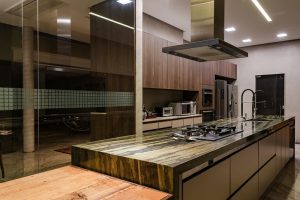 Na cozinha, o inox se junta com os demais materiais, conferindo o aspecto clean e tecnológico. A grande ilha em pedra no centro do espaço conta com duas cubas e um cooktop, além de armários embutidos, colaborando com a organização do ambiente.