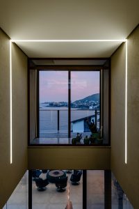A combinação dos materiais se faz presente tanto do lado externo quanto no interno da casa, com diferentes padrões e tonalidades em um único ambiente, o que resulta em um lindo contraste. A iluminação, por sua vez, não passa despercebida, contando com lâmpadas no teto, parede e perto do chão, além da grande quantidade de janelas e portas de vidro, permitindo que a claridade externa adentre abundantemente.