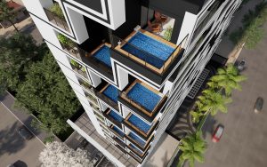 Além do atrativo das piscinas, o empreendimento conta com elementos como app de gerenciamento de segurança, estrutura para wi-fi de alta velocidade no pavimento rooftop, elevadores de alta velocidade, smart locker – armários inteligentes no térreo para recebimento de encomendas de forma segura e rápida, entre outros. Com fachada marcante e sofisticada, que se destaca no cenário urbano, ele traz também um design interno surpreendente. Emoldurado em pele de vidro, o último pavimento de lazer é um rooftop cinematográfico. Além da vista da cidade, o espaço conta com uma piscina de borda infinita em vidro, academia completa, bistrô, bar grill, spa, sauna, entre outras opções.