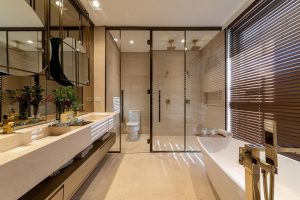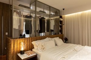 LEVEZA E TRANSPARÊNCIA – Traduzido num ambiente super luxuoso e sofisticado, a suíte master revela o cuidado com o acabamento das peças. O criado mudo, com caixaria nude e envoltório Brandy, é acompanhado pelos nichos na cor Brandy. O aparador com caixaria nude, envoltório e frentes em laca na cor Titan Opaco Dourado se estendem até o closet na cor nude, com portas em perfil bronze e vidro incolor. Essa foi a solução da arquiteta para empoderar as roupas expostas, como se fossem vitrines internacionais. Mantendo uma identidade, e em composição perfeita, está a cristaleira Paros, com perfil bronze e vidro incolor, e as prateleiras em vidro extra clear.
