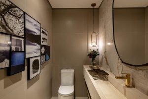 Para trazer ainda mais a sensação de casa e manter o alto padrão do projeto de decoração, o lavabo recebe em sua composição prateleiras suspensas com caixaria nude, envoltório e frentes com pintura em laca na cor Titan Opaco Dourado.