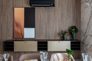Nesse projeto de 301 m², assinado pela arquiteta Fernanda Marques, foram atendidos os pedidos de uma família que valoriza versatilidade, criatividade e receber bem amigos e familiares. Localizado dentro do empreendimento MAI Terraces, da Construtora Laguna, o espaço oferece a experiência da casa, mas com a comodidade de morar em apartamento. “Quem busca a residência suspensa, quer alinhar a comodidade de condomínio com o espaço da casa. Por exemplo, o projeto tem pé direito duplo. Aqui, a área externa do apartamento é muito bem valorizada, já que o imóvel fica às margens de um dos mais belos parques de Curitiba, o Barigui”, conta Leandro Lorca, sócio-gestor da SCA Curitiba, responsável por todo o mobiliário planejado do projeto.