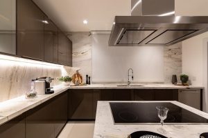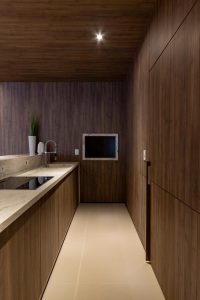 FUNCIONAL E CRIATIVO – Uma residência suspensa também significa espaço moderno e repleto de soluções criativas. O revestimento em madeira dos armários, tetos e paredes na área gourmet é o exemplo disso: ao mesmo tempo em que traz unidade cromática e estética, transforma parede e porta que conecta para a cozinha. O espaço reservado para preparar refeições enquanto se interage com os convidados possui uma churrasqueira e um extenso passa pratos. Na cozinha, os móveis foram todos planejados pela SCA Curitiba a fim de atender as necessidades dos moradores que preferem que os eletrodomésticos fiquem encobertos, deixando o visual mais clean. Outro destaque está na escolha da caixaria nude, envoltórios e frentes de vidro com perfil tartufo e vidro refletente bronze.