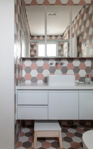 No banheiro, a arquiteta Marina Carvalho apostou na tendência do hexagonal em uma combinação de branco, cinza e rosa antigo | Foto: Evelyn Müller