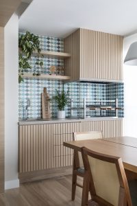 Nessa varanda, a parede em tons de azul fez presentes no desenho geométrico resultaram em um suave contraste com a marcenaria e o piso, ambos neutros | Projeto: Marina Carvalho | Foto: Evelyn Müller