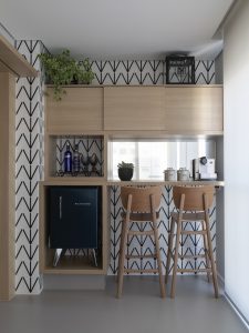 Nesse cantinho do café na varanda do imóvel, o azulejo com um suave toque geométrico revestiu as paredes, oferecendo movimento. A marcenaria e o piso contribuíram para o seu destaque | Projeto: Marina Carvalho | Foto: Evelyn Müller
