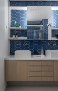 Nesse banheiro, a cerâmica chama atenção pelo tom de azul e pelo formato hexagonal. Em contrapartida, os demais elementos são mais discretos | Projeto: Marina Carvalho | Foto: Evelyn Müller