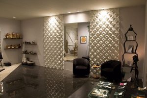 Na Casa Cor ES a arquiteta Marcela Carvalho usou o revestimento para valorizar a entrada do ambiente, com iluminação que destaca seus contornos e relevos. Foto – Vitor Carvalho
