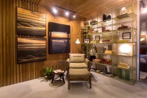 A Sala de Leitura da Casa Cor Ceará teve seu piso revestido com o cimentício Esagonale, segundo os profissionais responsáveis pelo ambiente, Marcilio Sousa e Luciana Brasileiro o Esagonale da Nina Martinelli “faz alusão aos pisos de cimento queimado das casas do interior do Ceará , o uso do formato hexagonal traz uma bossa com seu tamanho e sua forma e se destaca entre as linhas retas das estantes e frisos do teto, a cor fria faz contraponto com o teto e paredes revestidas de madeira natural.” Foto: Cris de Rossi.
