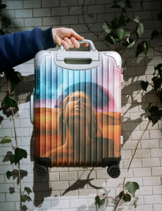Apresentando a expertise técnica da RIMOWA, a bagagem PALACE RIMOWA Original Cabin Desert traz no fundo do alumínio uma arte vibrante de uma paisagem distópica do deserto. Desenvolvida pelos artistas da PALACE em uma estética aerógrafo manual, a arte retrata uma figura nômade caminhando em direção a um monólito cromado, parecendo ser observada por uma escultura de areia de uma mulher. Para conseguir a inscrição detalhada, a RIMOWA aplica o seu domínio de impressão digital, assegurando um gradiente perfeito e pigmentos de cores vibrantes.
