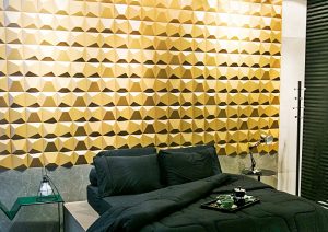 Trabalhando com alto relevo, a linha Block (15 x 15 cm) traz uma paleta de cor versátil. As cores iridescentes, com leve metalizado, dão um toque de ousadia e requinte. Na mesma toada, a linha Cubic (30 x 60 cm) explora a tridimensionalidade. Os traços peculiares do relevo fazem uma alusão ao diamante lapidado e os triângulos em alturas diferentes fornecem movimento às paginações. “Uma dica é optar por revestimentos neutros no piso, deixando os metalizados levarem protagonismo para as paredes”, diz a gerente de marketing.