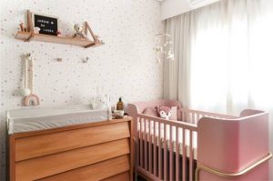 Neste projeto, a arquiteta Fernanda Emmerick trabalhou o charme do rose com o aconchego do tom Jequitibá usado na cômoda. Vale um destaque para a versatilidade do mobiliário: o berço pode ser montado em um primeiro momento como mini-berço, depois no formato tradicional e, posteriormente, pode se tornar uma mini cama.