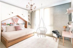 Neste quarto, planejado para uma menina de 2 anos, o rosa ganha um tom nude, que brinca com os elementos coloridos do papel de parede sem tornar o ambiente colorido em excesso. A cama escolhida foi a da “casinha farm”, que acompanha o desenvolvimento da criança por um bom tempo e incentiva a independência dos pequenos devido à altura adequada do colchão, que facilita o acesso.