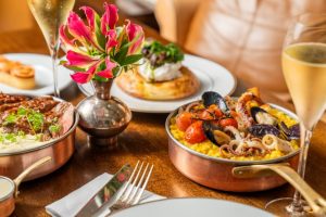 A versão vegetariana conta ainda com beterraba assada com queijo de cabra e molho Gribiche; tabule com iogurte de ervas, hommus e crudités; mais ovos florentines como entradas frias. Os pratos principais são arroz cremoso com peras confitada e queijo Roquefort; paella de legumes tostados; além do ravióli de abóbora.