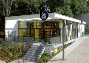 Na sequência, o samba e o pagode ganham destaque no Bar CanaBenta, clássico da boemia curitibana, com luminárias instaladas em pandeiros, que foram desenhados especialmente para o espaço. O piso é de ladrilho hidráulico; os cobogós amarelos remetem à década de 1970; e as grades de ferro completam a estética de uma casa brasileira típica. “É um projeto que fala de memória afetiva e que celebra o nosso cotidiano com humor e identidade”, destaca o arquiteto.