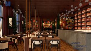 Nos restaurantes, o profissional propõe uma abordagem singular para o conjunto: cada restaurante foi pensado como uma extensão sensorial de um ritmo musical, materializando sons em formas, cores, texturas e experiências. “Cada casa tem uma personalidade e uma trilha sonora”, explica André Henning, que ficou também responsável pela ambientação externa da Rua da Música, desde o projeto de iluminação até o mobiliário do espaço.