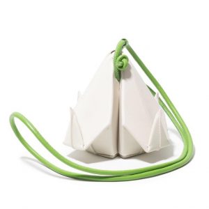 Já o segundo modelo, ‘Blossom’, é uma clutch em tamanho único que reinterpreta uma rosa feita em origami, acompanhada de uma alça verde clara, remetendo ao caule da flor. Para dar vida à peça, foram escolhidos os tons vermelho, verde bandeira e off white.