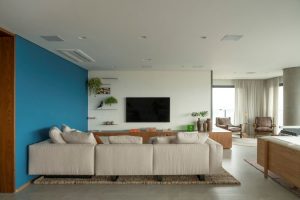 Na sala de TV, a arquiteta Patricia Miranda adotou um rodapé com apenas 3 centímetros de largura. De acordo com a especialista, a intenção foi conceder uma apenas uma ‘linha’ e abrir espaço para destacar os revestimentos das paredes | Foto: Cacá Bratke Produção: Debbie Apsan