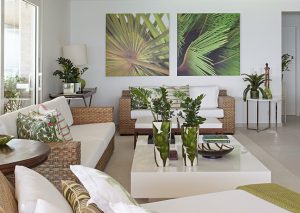 Para esse apartamento em Riviera de São Lourenço, em Bertioga (SP), as arquitetas Ieda e Carina Korman apostaram em um décor bastante tropical, marcado por uma paleta de branco e verde. “Cores claras absorvem menos calor e são uma ótima escolha, tornando o ambiente mais fresco e iluminado”, indicam. Com 40 m², o living foi pensado para proporcionar aconchego a todos, composto por sofás e chaises rústicos, de fibra natural. Uma curadoria de arte bem cuidadosa veio para reforçar o clima tropical. “Detalhes fazem a diferença. Trouxemos o verde através das fotografias e estamparia, nas capas de almofada e objetos decorativos”, diz Ieda.