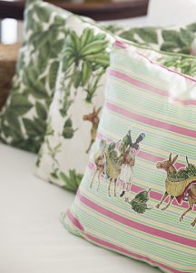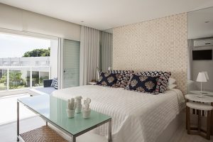 Por fim, as áreas íntimas também podem – e devem! – receber um décor leve. Nessa suíte, em um apartamento no Guarujá, a cabeceira chama a atenção: a primeira vista, ela evoca as fibras naturais, mas é, na verdade, composta por pastilhas de mármore travertino bruto. “Para complementar, é sempre importante escolher tecidos leves e fluidos, como de linho e algodão”, diz Carina. Compondo perfeitamente com o clima do ambiente, as almofadas ganharam capas com temas marinhos.