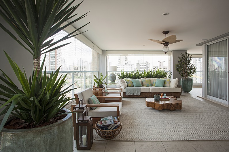 O conceito de biofilia está cada vez mais em alta – e não é sem motivo! Trazer as plantas e o verde para dentro de casa é uma forma de melhorar a qualidade de vida, conferindo até mesmo mais conforto térmico. Por isso, Ieda e Carina Korman trouxeram bastante verde para essa varanda de 70 m², em São Paulo. “Projetamos uma varanda com ares de sala de estar, mas sem perder a essência do ambiente. Por isso, os materiais naturais foram bastante explorados”, indica Ieda. Os móveis são rústicos, de fibra natural e madeira, e repousam sobre um tapete leve. O verde está presente no paisagismo e também nos detalhes, como no tom dos vasos e almofadas. Para garantir todo o conforto, um ventilador de palha foi posicionado no centro do espaço.