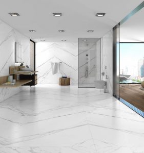 Level Acabamentos: inovação ao integrar e compor o material na parede e também no piso. Na foto, Maximum Marmi Calacatta Fiandre nas medidas 300×150 e 150×150.