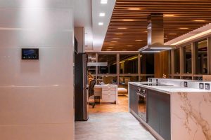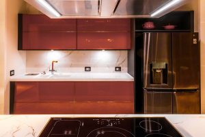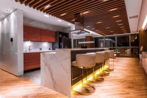 Em um ano de obra, o escritório precisou criar um ambiente moderno, que revelasse através da arquitetura as mesmas características da empresa: inovadora e elegante. “Fizemos uma proposta que envolveu a modernidade nos detalhes e nos sistemas construtivos e a sofisticação deixamos para os móveis e painéis”, acrescenta Saia. Para que o projeto atendesse a demanda do cliente, foram utilizados o mobiliário high end da Florense, da loja da Carlos de Carvalho, em Curitiba (PR). A marca italiana desenvolveu o balcão do escritório e os móveis da cozinha com o acabamento High Gloss Branco, Laminado BP Grafite e destaque para as portas de vidro Pitanga. “Tivemos um grande prazer em ter a Florense executando esse sonho conosco. Nos auxiliaram muito no desenvolvimento dos sistemas construtivos e executaram perfeitamente o que nós e os nossos clientes havíamos planejado”, acrescenta o arquiteto.