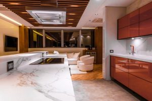 Sala presidencial com 200m² apresenta cozinha, dois livings e escritório totalmente integrados e com mobiliário da Florense Carlos de Carvalho