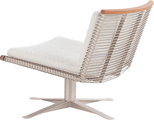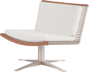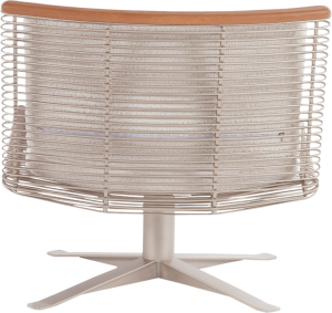 Poltrona e banqueta com estrutura em metal, disponível nas cores metalizadas cinza, champagne, preta e dourada. Detalhes em madeira maciça, tecido ou couro. A produção da poltrona e da banqueta é feita a mão — com mais de 400 pontos de solda em sua estrutura, um trabalho artesanal e personalizado.