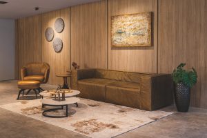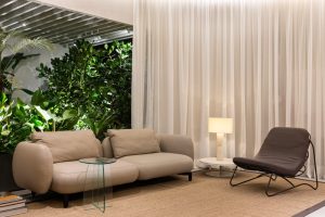 Além disso, em parceria também com outra loja de Curitiba – Naturale Tapetes – , a Salva esteve presente no Lounge Oasis, projetado pela Mapogos Design. Uma das peças destaque que havia no ambiente era o sofá Noll. Com suas linhas retas e design minimalista, ele se encaixava na proposta do escritório de arquitetura, complementando a estética de tons de marrom no espaço.