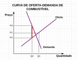 Agora, vejamos a diferença entre os compradores de combustível e os de cenoura para concluirmos quem está, efetivamente, pagando a maior parcela do imposto. No gráfico ao lado desenhei o comportamento do preço do combustível. Note a inclinação da curva de demanda representando a inelasticidade do bem. Veja que P3 – P1 continua sendo o imposto pago pelo comprador, enquanto P1 – P2 continua sendo o montante pago pelo vendedor. Nesse cenário, o comprador está pagando mais pelo imposto!