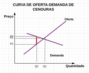 Em compensação, veja na figura ao lado o que ocorre com o preço da cenoura. É um bem mais elástico, então a parcela de imposto pago pelo vendedor é maior que a do comprador! Assim, parece que existe uma relação: bens mais elásticos, aqueles encontrados em mercados mais competitivos, fazem com que os impostos recaiam sobre o produtor! Em contrapartida, em mercados mais monopolizados, o imposto costuma cair sobre o consumidor.