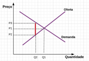 Esse gráfico hipotético que desenhei ao lado mostra esse comportamento. Veja que, quando o preço de um determinado bem aumenta, a quantidade demandada (i.e., de compradores) costuma cair. E a quantidade ofertada (ou seja, de vendedores) costuma subir! Agora o que ocorre na incidência de um imposto? Coloquei esse efeito pintado de vermelho de forma que o imposto total é P3 – P2. Nesse cenário, o valor percebido pelo comprador é maior, enquanto o valor percebido pelo vendedor é menor. A leitura do gráfico nos permite concluir que a quantidade de imposto pago pelo comprador é P3 – P1 e pelo vendedor P1 – P2. Afinal, sem imposto ambos fariam a transação pelo preço P1!
