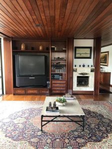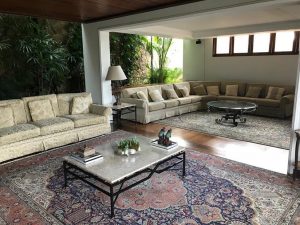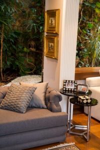 Na sala de jantar, o aparador foi trocado por novas mesas de apoio, mais modernas, com acabamento em prata e fundo espelhado. As cadeiras receberam novo estofamento e as cortinas deram mais privacidade e maior controle da luminosidade externa. Na sala de estar, novas poltronas, sofás receberam novos tecidos e almofadas deixaram o ambiente mais aconchegante. Mesas de apoio e folhagens preencheram o espaço e as janelas também receberam cortinas. Os quadros que decoram as salas receberam novas molduras e foram pendurados em locais cuidadosamente planejados para ficarem em evidência.