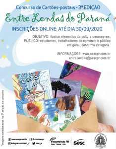 Estão abertas as inscrições para a terceira edição do concurso Entre Lendas do Paraná, uma iniciativa da Gerência de Educação do Sesc PR, em parceria com a Academia Paranaense de Letras, que vai selecionar 105 ilustrações de lendas, mitos, locais, fatos ou personalidades históricas do Paraná. Essas inscrições podem ser realizadas até o dia 30 de setembro de 2020 no site do Sesc Paraná, ou por envio via correio às Unidades, conforme edital.