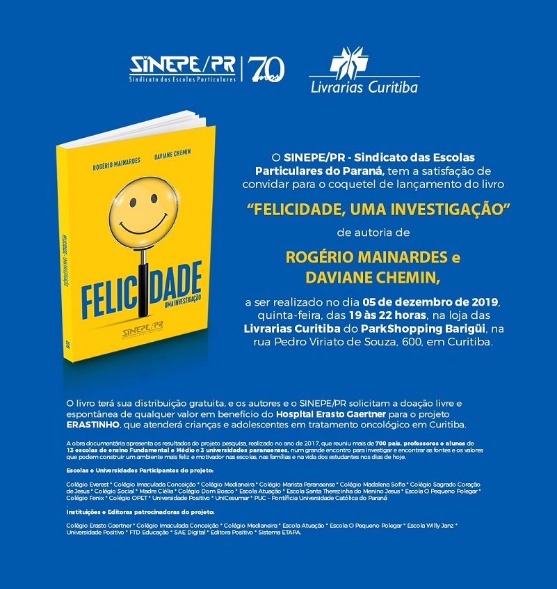 Em comemoração aos seus 70 anos de fundação, o Sindicato das Escolas Particulares do Paraná (SINEPE/PR) promove o lançamento do livro “Felicidade, uma investigação”, no dia 05 de dezembro, quinta-feira, a partir das 19 horas, na Livrarias Curitiba do ParkShoppingBarigui. A obra, de autoria do executivo e empresário, Rogério Mainardes, reconhecido como um dos grandes nomes em Comunicação e Marketing em nosso país, foi escrita em coautoria com a psicóloga e especialista em Gestão e Desenvolvimento de Equipes, Daviane Chemin.