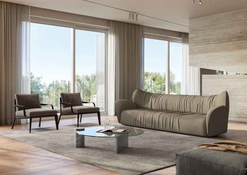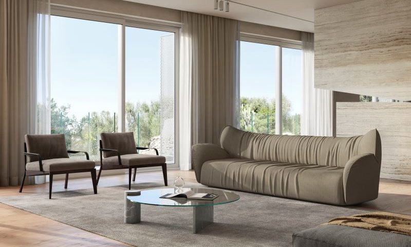 O sofá Juno, com suas formas envolventes, traz um design que traduz um refúgio de conforto mediterrâneo