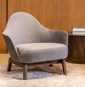Estrutura em madeira maciça grandis. Encosto em multilaminado curvado. Revestimento em tecido com espuma D30. (L77 x P95 x A116cm)