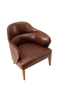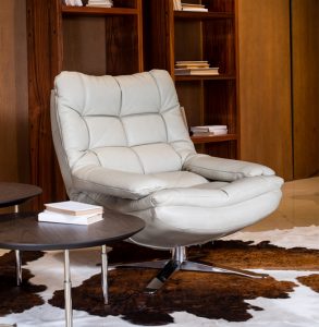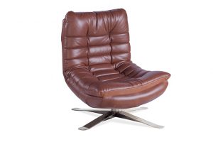 Estrutura em aço revestido com espuma e manta siliconizada. Base em inox nas cores opcionais. Revestimento somente em couro natural, com costura quadriculada. (L90 x P105 x A91 cm)