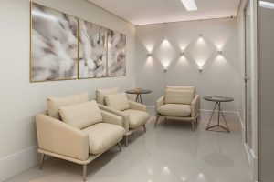 Totalizando 275 m², o empreendimento conta com recepção; sala de utilidades; depósito; sala de esterilização/higienização; estar íntimo/copa; consultório principal, espaço para procedimentos; sala de fototerapia; sala de exames; consultório auxiliar; sala VIP e banheiros – com projeção futura de também integrar um consultório de otorrinolaringologista. “O consultório principal e a sala de procedimentos são destaques do projeto, pois requerem atenção dobrada com diversas normas da área médica, especialmente a RDC50, que normatiza a operação desses profissionais”, explica a arquiteta.