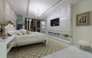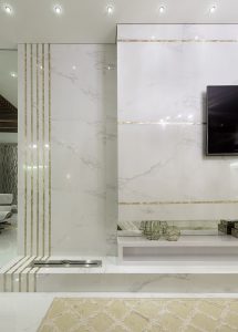 O recurso foi utilizado pelas arquitetas catarinenses Mariana Maran e Daiane Mello Campos na Suíte Master da CASACOR Santa Catarina/Itapema 2018. A lareira se transformou em um painel sofisticado e minimalista na composição do porcelanato HD Polido Le Blanc 84x84cm da Cerâmica Elizabeth com um filete único dourado. “Todos os visitantes nos perguntavam ‘Qual é a pedra que vocês utilizaram nessa parede?’, dada a semelhança com um silestone, uma pedra de custo muito mais alto. Ficou uma paginação com um resultado surpreendente, sofisticado e com preço acessível”, destaca Mariana.
