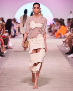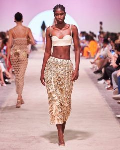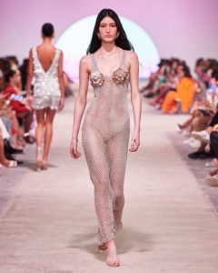 Nesta temporada, a alfaiataria repaginada foi destaque na apresentação da linha, trazendo um toque muito sofisticado e elegante às peças, com recortes ondulados que imitam formas orgânicas da natureza. Peças com pespontos manuais que adicionam uma dimensão natural e única ao visual também foram apostas da grife. “Como ponto alto, trouxemos o tecido em tela metalizada para inspirar a atmosfera mística e poética da conexão entre o sol e o mar também representada pelo cenário do desfile, adicionando um brilho radiante e uma aura de mistério a cada look.”, ressalta Nastácia.