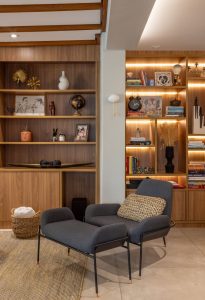 LIVING: No espaço de convívio, foi criado um ambiente acolhedor com poltronas e uma mesinha baixa, situada entre a cozinha e a sala de jantar. Esse espaço permite aos moradores receber convidados enquanto cozinham, proporcionando um ambiente intimista para servir aperitivos antes do jantar.