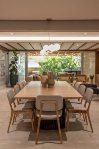 SALA DE JANTAR: Considerando a família grande que usa o apartamento como ponto de encontro, a sala de jantar foi equipada com uma ampla mesa que acomoda todos. Adjacente a esse espaço, foram criadas áreas de bar e estante. O casal, amante de estudos e viagens, valoriza a estante para exibir sua coleção de livros e lembranças de viagens. A parte inferior da estante foi pensada desde o início para guardar os brinquedos da filha, que estava a caminho.