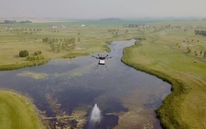 Um drone DJI M600 que entrega pacotes para seus clientes no King’s Walk Golf Course, em Grand Forks, Dakota do Norte